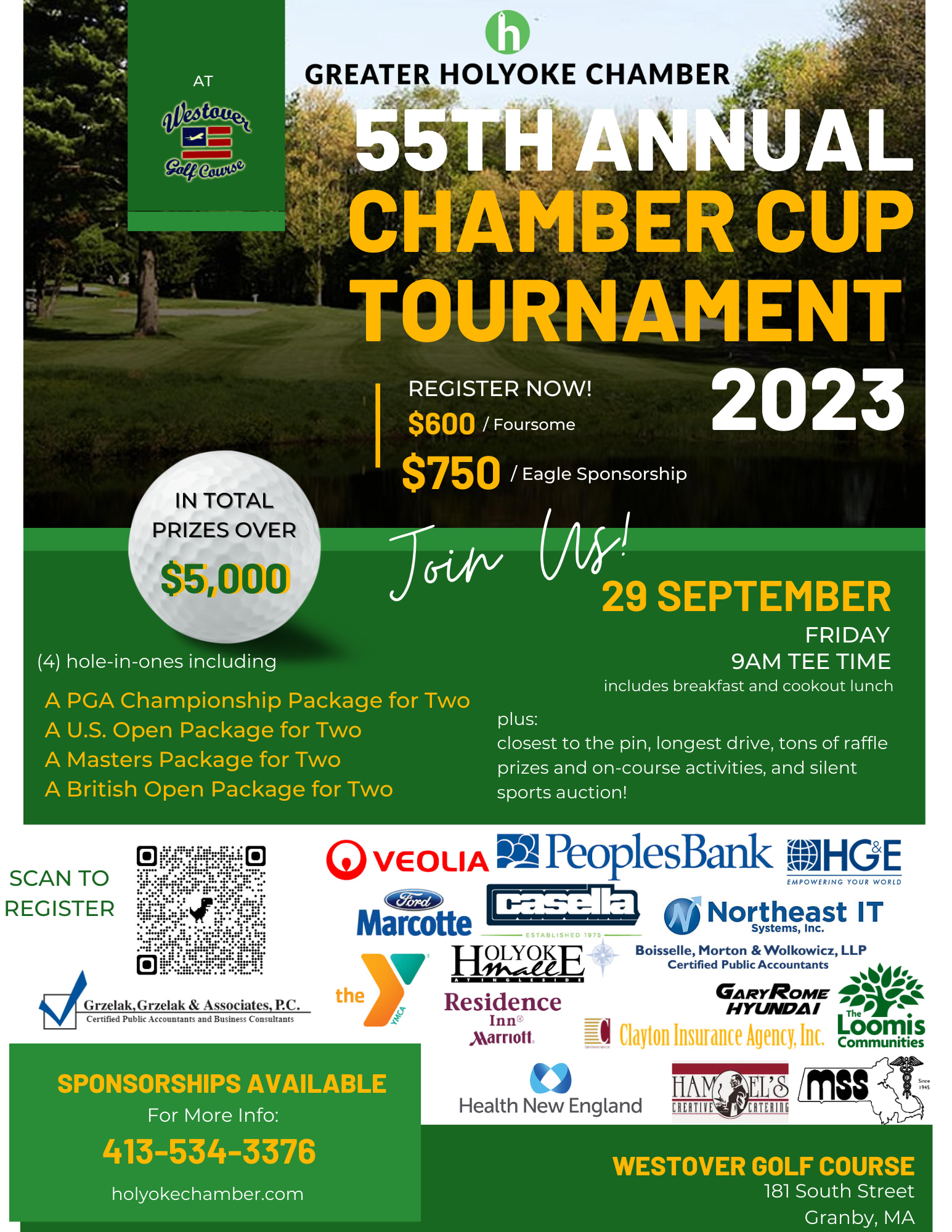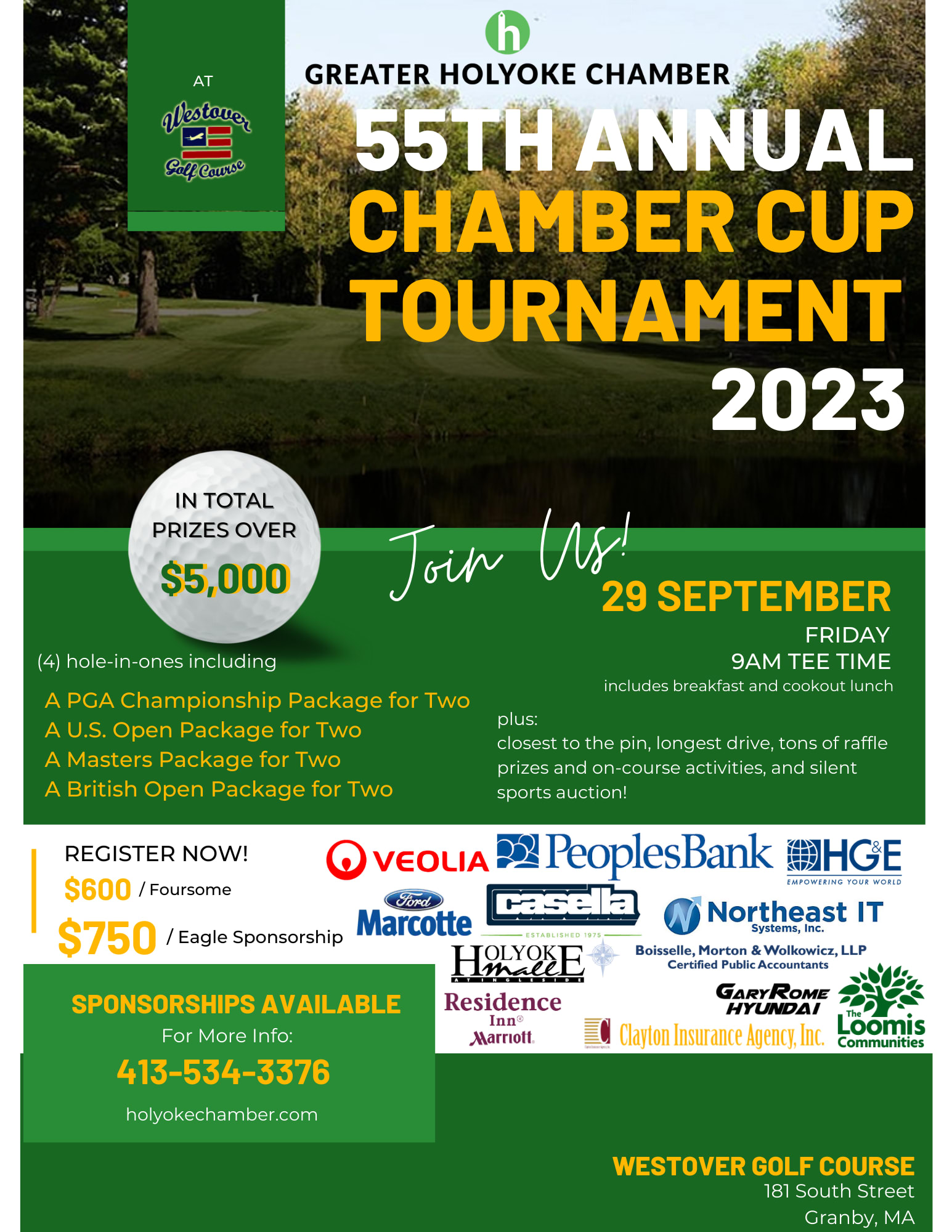 Join us for our 55th Chamber Cup! Kickstart your weekend with us on the exciting and fun Westover Golf Course! See cargo planes fly overhead while you and your team enjoy a day of light competition, on-course activities, and one of our many hole-in-one prizes, including a trip for 2 to The Masters! As always, players receive a swag bag with a 1/4 zip jacket, 2 drink tickets, and other goodies to get you through the day. End the day with a silent sports auction, dinner buffet, and a chance to win tons of great prizes! Prizes awarded for the longest drive and closest to the pin.Images