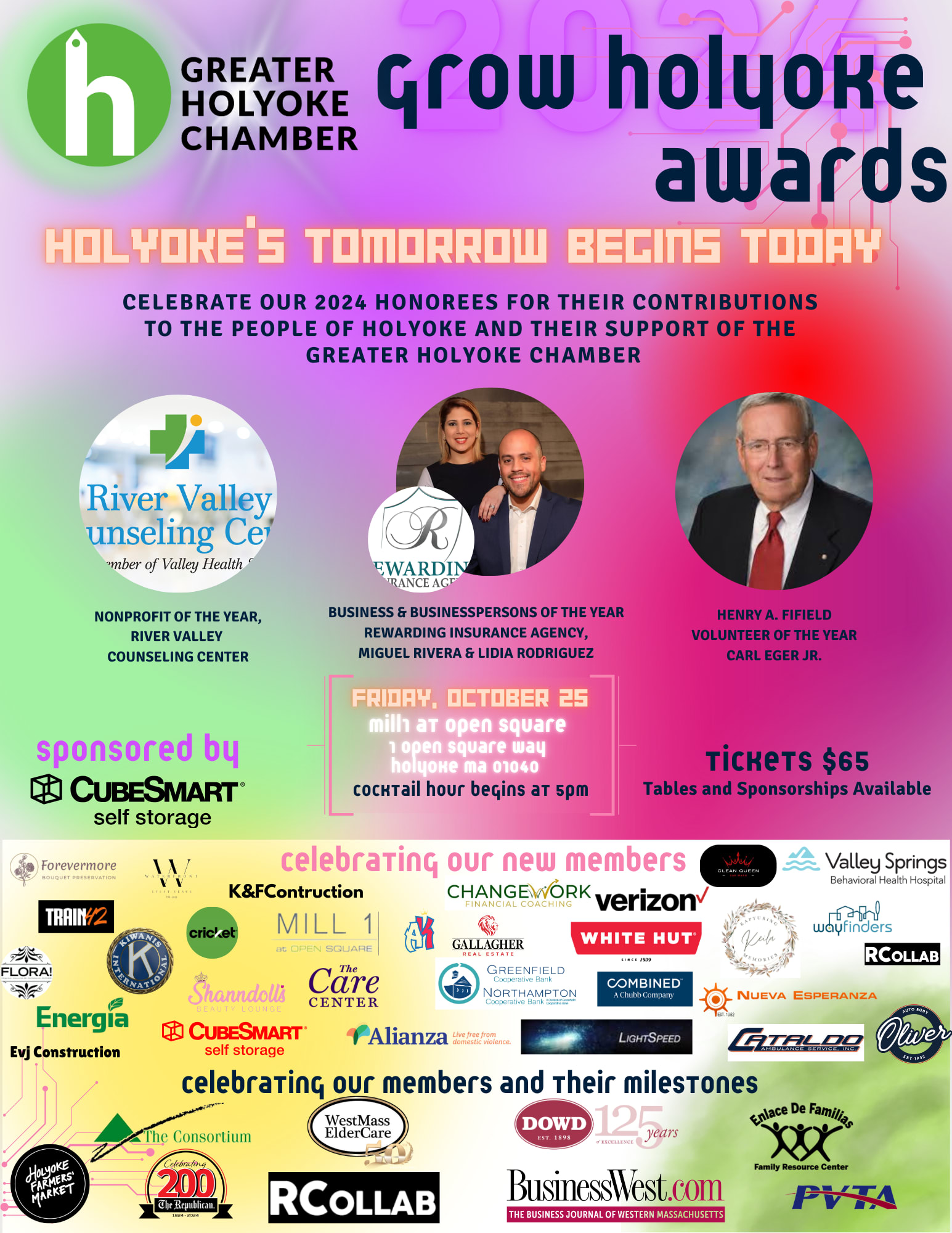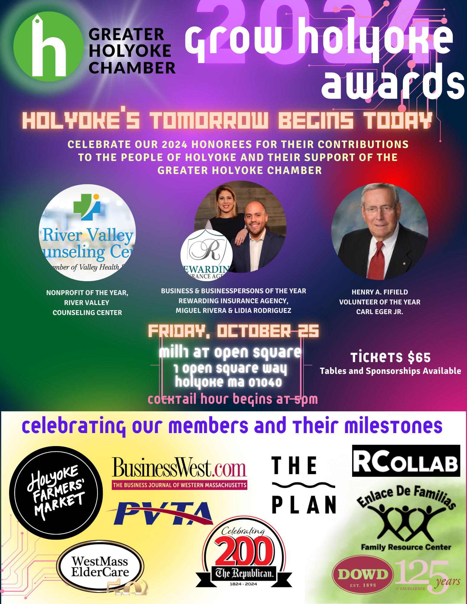 HOLYOKE'S TOMORROW STARTS TODAY! Join us for an exceptional evening celebrating the outstanding achievements and remarkable contributions of our business owners in Holyoke. This year's honorees include Business of the Year Rewarding Insurance Agency, Businesspersons of the year Miguel Rivera & Lidia Rodriguez, Henry A. Fifield Volunteer of the year Carl Eger Jr, and Nonprofit of the year River Valley Counseling Center. They have helped shaped our city over the year, and we are proud to showcase their accomplishments.